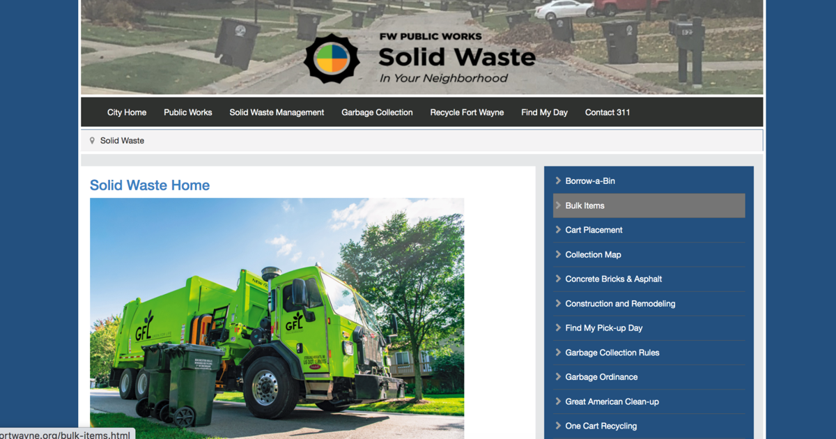 The City of Fort Wayne also has a website with lots of information ranging from pick up days to how loose items will be handled. The website, cityoffortwayne.org/solidwaste, can be translated into two other languages: Spanish and Burmese.